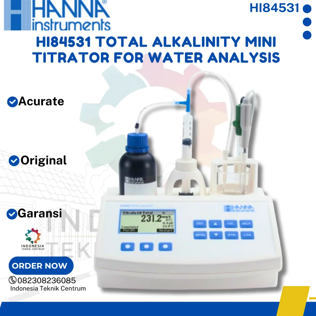 Fungsi utama HI84531 adalah untuk menentukan Alkalinitas Total (dan juga Alkalinitas Kuat atau Strong Alkalinity) dalam sampel air melalui metode titrasi potensiometri dengan menggunakan elektroda pH/mV.